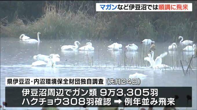 10月24日に財団が行った独自調査では、伊豆沼周辺でガン類が9万3305羽、ハクチョウが308羽確認され例年並みに飛来が進んでいます。