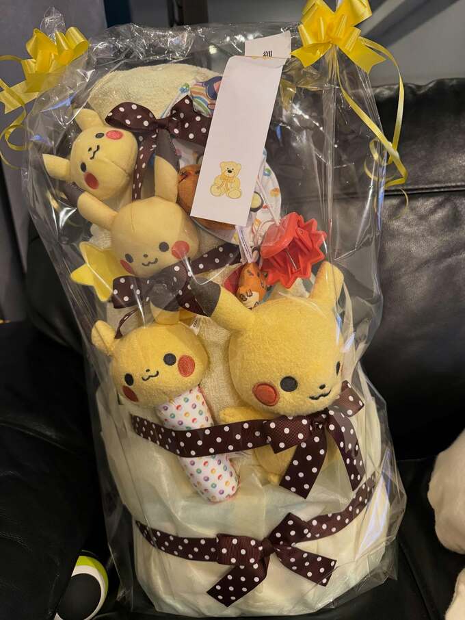 さらに「ピカチュウオムツケーキ」と呼ばれるおむつやぬいぐるみなどを詰め合わせた贈り物も紹介。「ぬいぐるみおもちゃつきでポケモンで遊ぶ未来がみえる!」と将来の子どもたちの姿を想像し、「開封したらオムツの柄がしまじろうでした!黄色い人気者同士だからいいんだね!」と愛らしい言葉で表現しています。