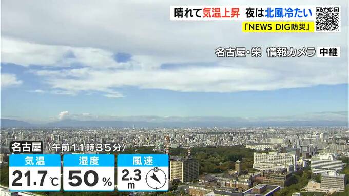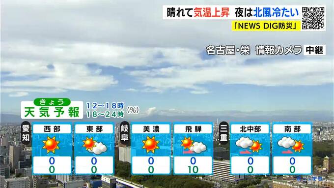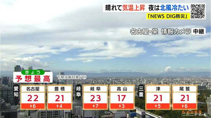 最高気温は名古屋や岐阜、津などで22℃前後、高山で17℃の予想です。夜は北寄りの風が強まり、空気がヒンヤリとするでしょう。