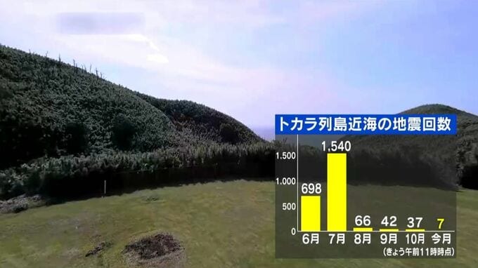 トカラ列島の悪石島から小宝島にかけての海域では、今年6月以降、地震が相次ぎ、7月はひと月で1500回を超えました。その後は減少傾向となり、10月は37回、今月は6日を含めてこれまでに7回となっています。
