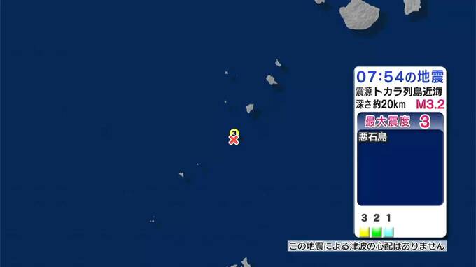 気象庁によりますと、6日午前7時54分ごろ、トカラ列島近海を震源とする地震があり、悪石島で震度3を観測しました。震度3を観測したのは、先月25日以来です。