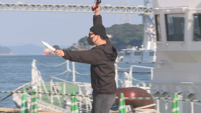着岸した外国の客船にテロリストが乗船しているという想定です。通報を受けた警察が周囲の立ち入りを制限し、警戒にあたります。テロリストは発見されるとピストルと刃物を持って抵抗します。