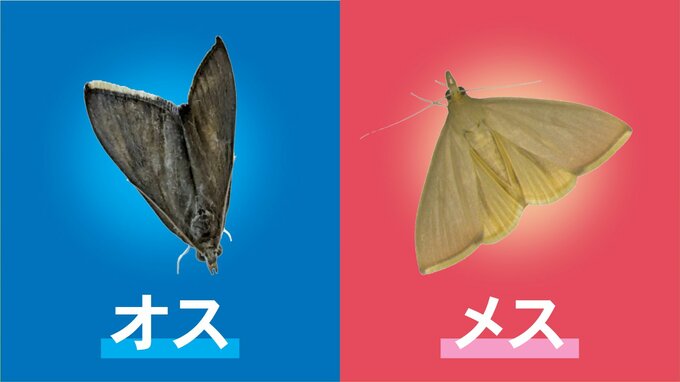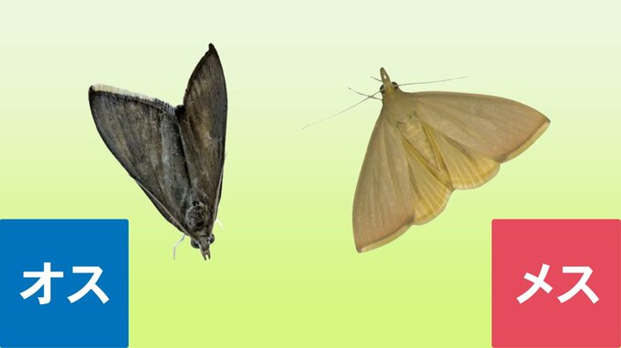 前翅(はね)の縁は先端部が緩く曲がっていて、オスとメスで色が異なります。オスは灰褐色で先端部などが暗色、メスは黄褐色で末端部分がピンク色をしています。