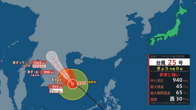 気象庁によりますと、台風25号はきょう(6日)正午には、非常に強い勢力で南シナ海にあって1時間に約30キロの速さで西へ進んでいます、