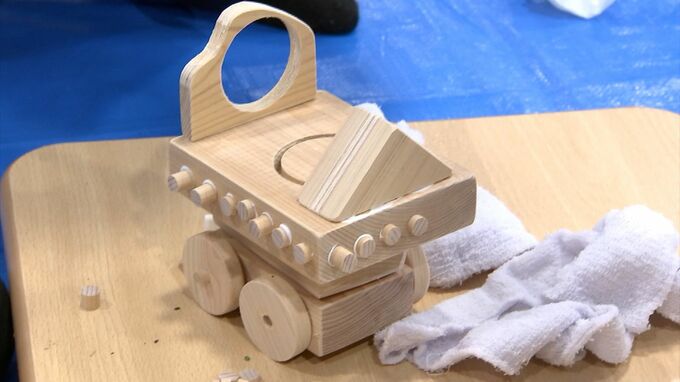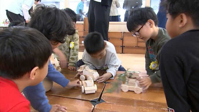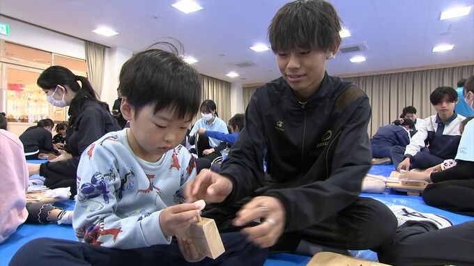 子どもの時から木材の良さに触れ、親しんでもらおうと企画されたものです。“東岡山IPUこども園”の約70人の園児が参加し、岡山後楽館高校の生徒らと一緒におもちゃを作りました。