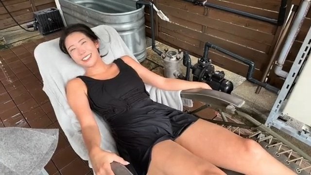 さらに穂川さんが訪れたのがサウナ。すでにサウナそのものにこもった後、テラスに出てきて「ととのう」様子が収録されています。上下とも黒のタンクトップと短パンで、汗に潤った肌をさらした穂川さんは「ここは本当に大好きでお気に入りな場所です」とデッキチェアに寝そべってリラックス。