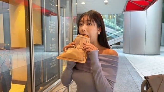 穂川さんは「休日は外食するのが好きなんですけど」と、ベーカリーの外のテラス席でクロワッサンを掲げてご満悦の笑みを見せています。口を大きく開けてガブリとかみついたのはクロワッサン。