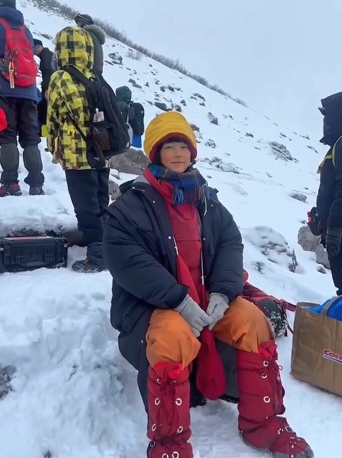 投稿された動画には、雪山での撮影風景が収められています。女性で初めてエベレスト登頂に成功した登山家・田部井淳子さんをモデルにした、主人公・多部純子の青年期を演じるのんさんは、防寒着を何重にも重ね着した様子で、登山装備を身にまとっています。撮影の合間なのか、雪のやんだ山の中腹で、腰をかけてカメラに向かって笑顔を見せるのんさん。頬は雪焼けしているように見えます。