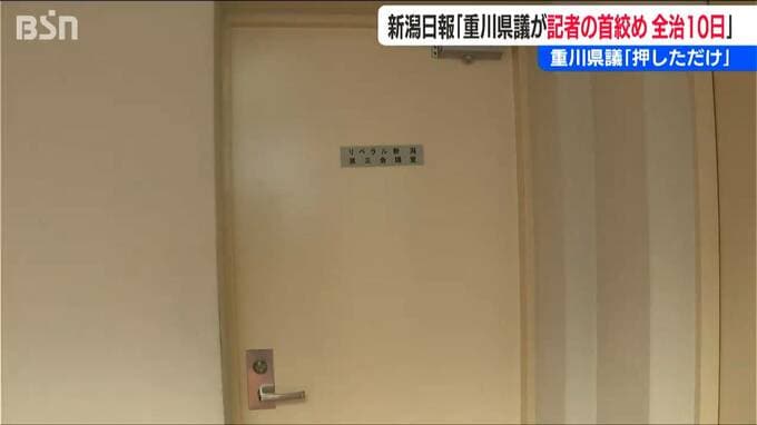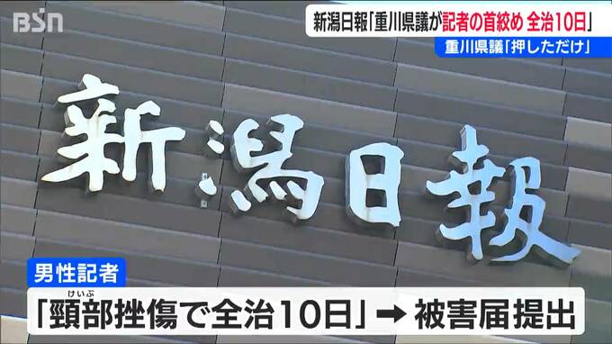 新潟日報社は6日、「県議会庁舎で取材をしていた記者が重川隆広県議から首を絞められ全治10日のけがをした」と報じました。