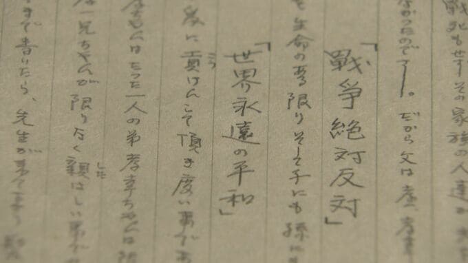 遺書の文中、「戦争絶対反対」と「世界永遠の平和」は、大きな文字で一行ずつ書かれている。幼い子供たちが読めるように、漢字にはところどころ、読み仮名がふってある。