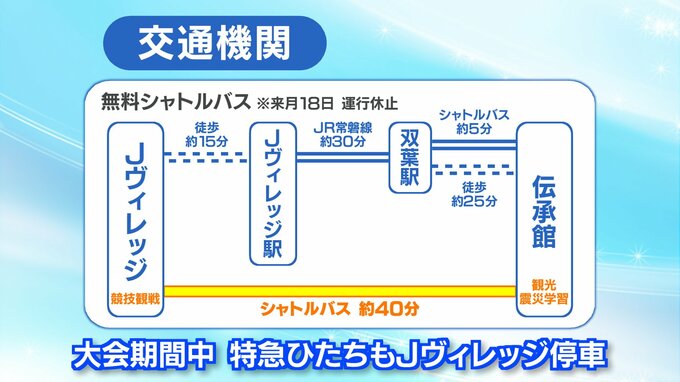 大会期間中の14日から24日までは、Jヴィレッジと双葉町の東日本大震災・原子力災害伝承館を結ぶ、無料のシャトルバスが運行されます。このシャトルバスは、事前の申し込みは必要ありませんが、18日は伝承館が休館日ということで、運行しませんのでご注意ください。詳しい発着時間は、福島県の公式ホームページをご確認ください。また、大会期間中は常磐の特急ひたちも最寄りのJヴィレッジ駅に臨時停車するということです。