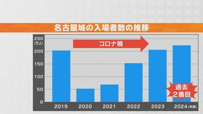 名古屋城総合事務所によりますと、昨年度の名古屋城の入場者数は、223万人あまりと前年度から1割ほど増え、過去2番目に多い数字でした。コロナ禍での落ち込みから順調に増えています。