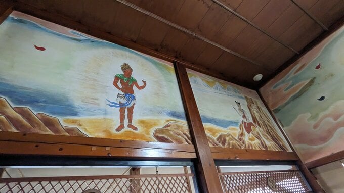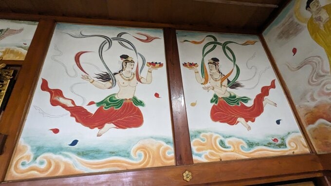 本堂を見渡すと、仏画家の笹沼寛祐画伯が14年かけて描いた42枚の壁画が飾られています。