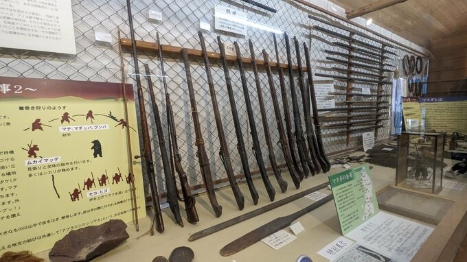 また、マタギに関する展示では野兎を捕まえる道具や、小鳥を捕まえるワナ、火縄銃などが並べられています。