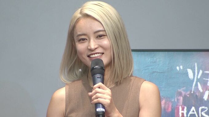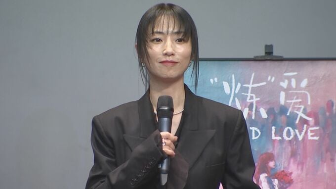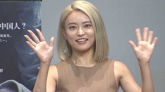 明るいキャメルのワンピースに、ブロンドヘアを合わせた姿で登場した小島さんは、流暢な中国語であいさつ。中国滞在中に、お茶を学んでいたことや、竹内監督と南京で食べたザリガニ料理に感動したエピソードを披露しました。