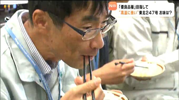 東北247号が炊き上げられ、コメの開発にあたっている研究員らが食味を確かめました。