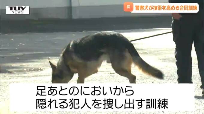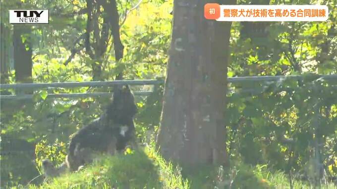 きょうの訓練には県警の警察犬1頭と、民間の嘱託警察犬など13頭に、その指導手が参加。訓練技術向上や警察犬の能力を高めるため、今回初めて合同訓練が実施されました。