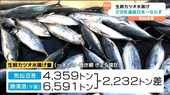生鮮カツオの水揚げが記録的な不漁に見舞われている気仙沼港は、2025年シーズンの漁が終盤を迎え、29年連続日本一は達成出来ないことが確実となりました。気仙沼漁協などによりますと、気仙沼港の「一本釣り」と「…