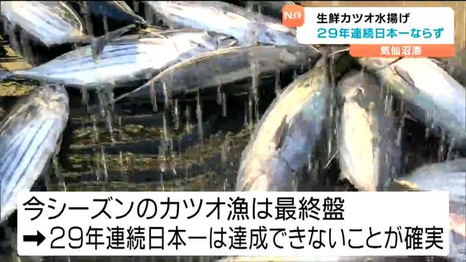 生鮮カツオの水揚げが記録的な不漁に見舞われている気仙沼港は、2025年シーズンの漁が終盤を迎え、29年連続日本一は達成出来ないことが確実となりました。