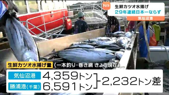 気仙沼漁協などによりますと、気仙沼港の「一本釣り」と「巻き網」を合わせた生鮮カツオの水揚げ量は11月6日現在で震災後、最も少なかった2022年の9306トンを下回る4359トンとなっていてトップの千葉・勝浦港に2232トンの差をつけられています。