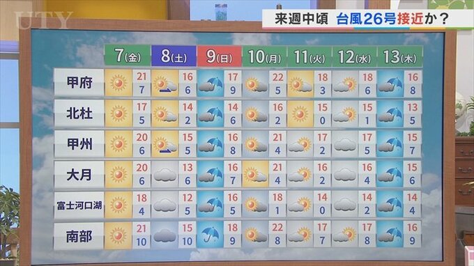 これを踏まえまして、週間天気を見ていきますと、あさって土曜日は中・西部を中心に晴れます。東部・富士五湖では湿った空気の影響を受けやすく曇り空。