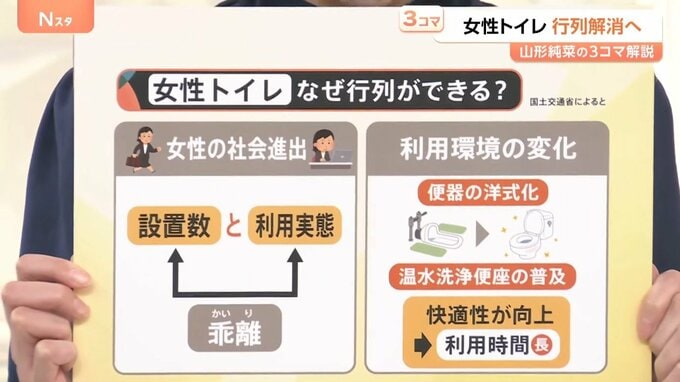6日の有識者会議では、女性トイレに行列ができる理由として、▼女性の社会進出で便器の設置数と利用実態に乖離が生まれていること、▼和式から洋式に変わるなど、利用環境の変化があったことがあると説明されました。