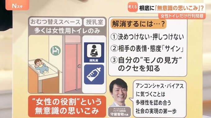 トイレでいうと、おむつ替えスペース、授乳室は、女性用トイレのみにあることが多いですが、これも“女性の役割”という無意識の思い込みだといいます。