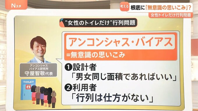 女性のトイレ行列問題でいうと、設計者は「男女同じ面積でトイレを作ればいい」、利用者は「(女性のトイレの)行列は仕方ない」と、両者に無意識の思い込みがあるということです。