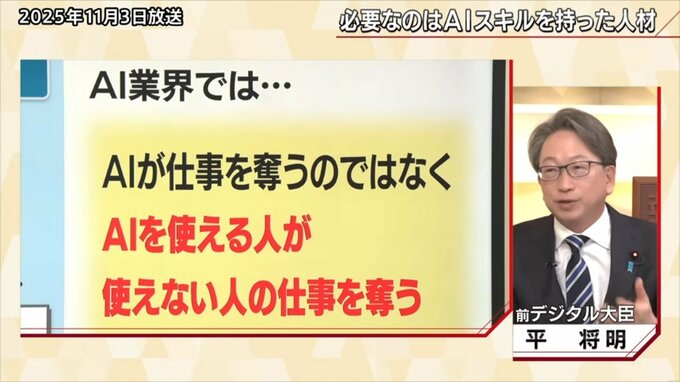 「(日本の会社には)匠の技がいっぱいある。工場のオペレーションとか…。で、これからはホワイトとブルーの両方できる人…、“水色の人”は求められる。匠の技を熟知していてAIを活用してリソース配分を考えられる人。両方わかる“水色人材”が人手不足の中何とかオペレーション回す…」