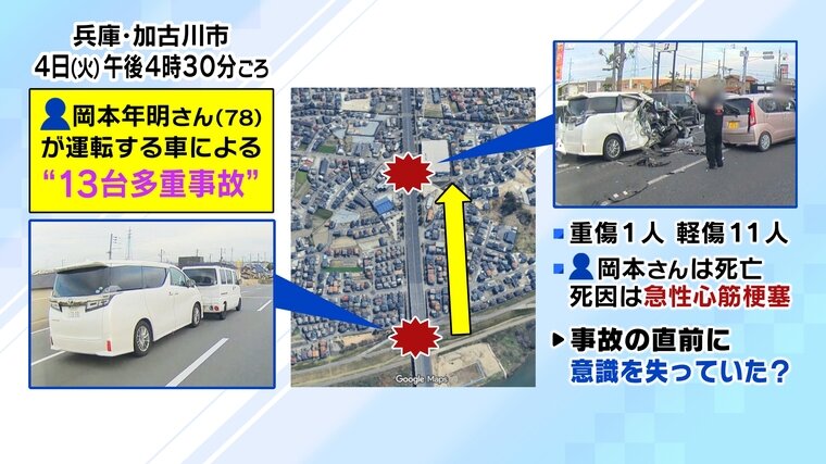 11月4日、兵庫県加古川市で車13台が絡む多重事故が発生。この事故で車列に突っ込んだ車を運転していた岡本年明さん(78)が死亡しました。また、助手席に乗っていた70代男性が胸の骨を折る重傷、2歳~6歳の子ども4人を含む計11人が軽傷だということです。