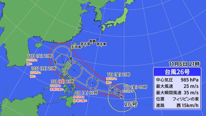 台風26号は6日午後9時現在、フィリピンの東にあって、1時間に約15キロの速さで西へ進んでいます。中心の気圧は985ヘクトパスカル、中心付近の最大風速は25メートル、最大瞬間風速は35メートルです。