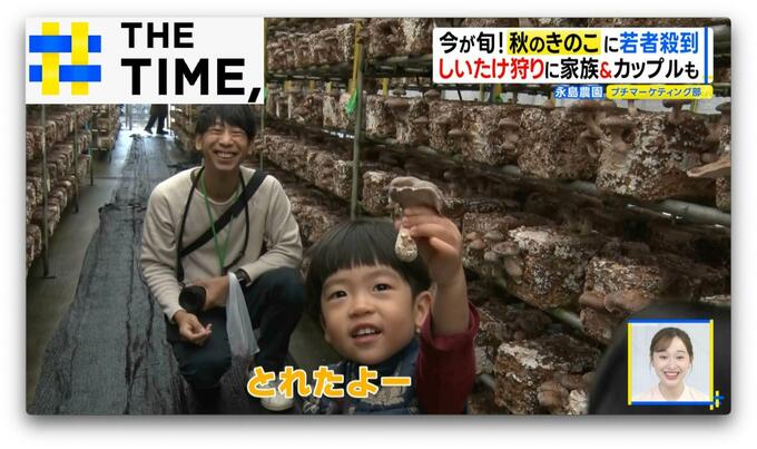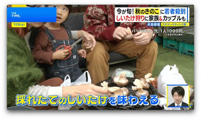 秋の恒例「シイタケ狩り」(100g:350円)が人気ですが、ビニールハウスの横には“バーベキュー場”も併設。採れたてのしいたけを焼いて味わうことができます。(1人1000円※未就学児は無料)