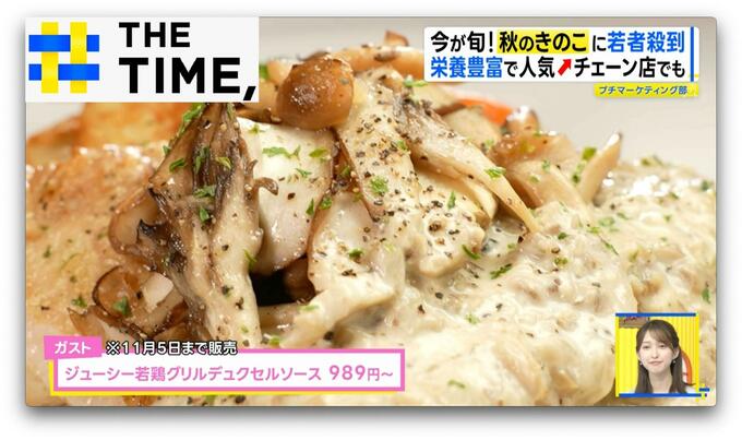 ポルチーニ茸やマッシュルーム、トリュフなど5種類のきのこの旨味を凝縮したソースを使った「ジューシー若鶏グリルデュクセルソース」(989円~※11月5日まで販売)や、「6種きのこと炙り生ハムのクリームパスタ」(1099円)など3メニューが楽しめます。