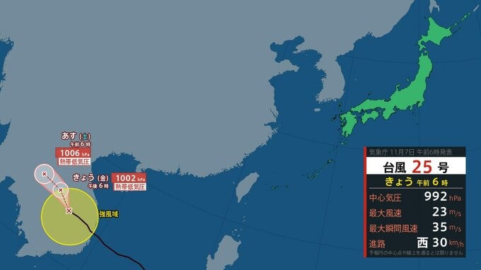 気象庁によりますと、台風25号はきょう(7日)午前6時には、カンボジアにあって1時間に約30キロの速さで西へ進んでいます、
