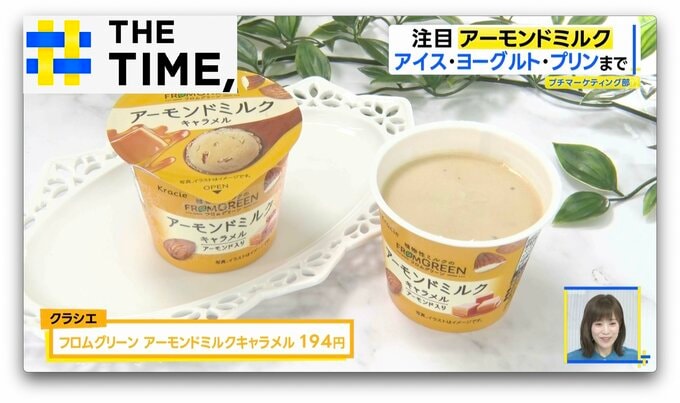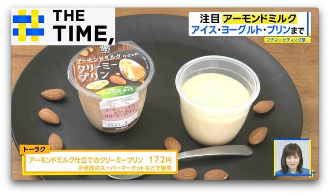 アーモンドミルクのスッキリとした後味と卵の濃厚な旨みが味わえる「アーモンドミルク仕立てのクリーミープリン」(トーラク/83g・172円)などスイーツにも幅広く活用されています。