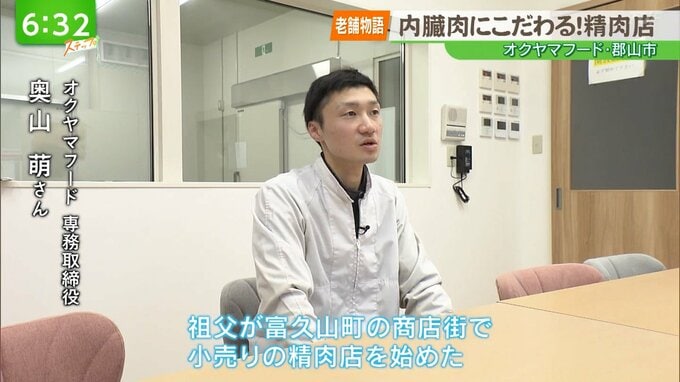 --奥山萌さん(オクヤマフード 専務取締役)「祖父が富久山町の商店街で小売りの精肉店を始めたのが始まりだと聞いております。対面販売の形で販売している精肉店。」