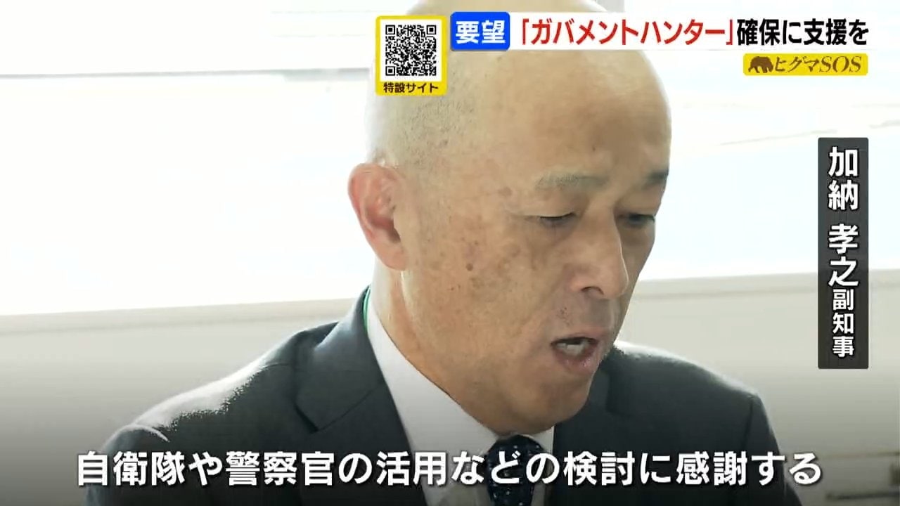 駆除の担い手が高齢化しているため、銃を取り扱った経験がある自衛官や警察官が退職後にガバメントハンターとして自治体に再就職できるよう、国の支援などを求めています。