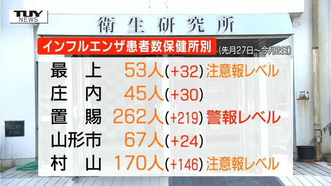 保健所別では置賜で262人、村山で170人、山形市で67人、最上で53人、庄内で45人となっていて、置賜保健所で警報レベル、村山と最上保健所で注意報レベルとなっています。