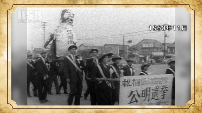 「公明選挙」の横断幕の後ろには、「所得倍増」と書かれた人形を担ぐ人々が。