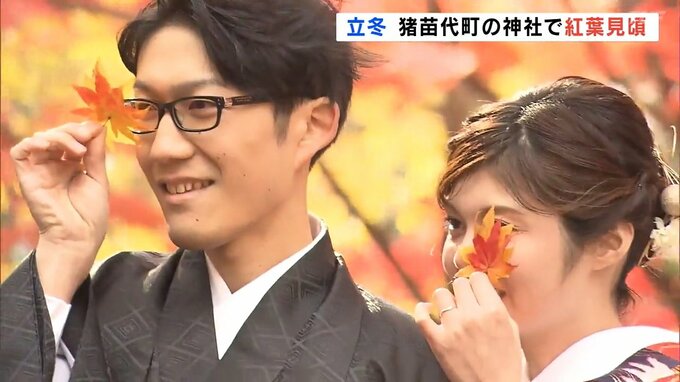 モミジを手に微笑む新婚の夫婦。真っ赤に染まった紅葉が、2人の門出を祝います。