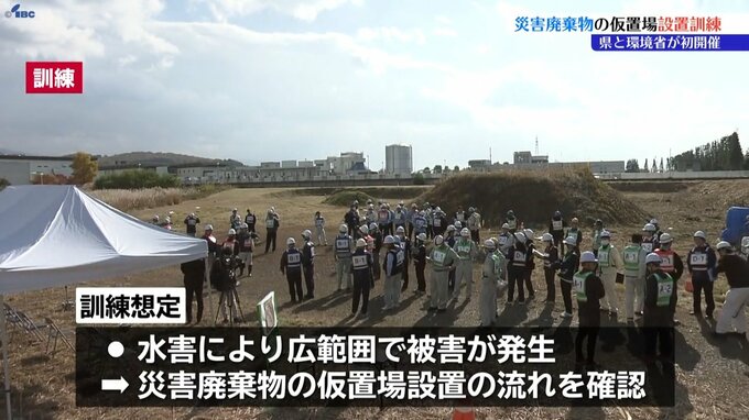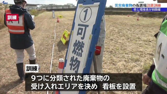 訓練は水害により広範囲で被害が発生した想定で行われ、住民が片付けで持ち込んだ災害廃棄物を受け入れる仮置場の設置の流れを確認しました。