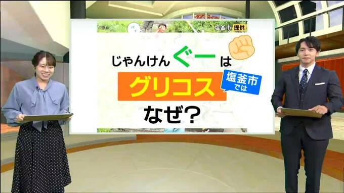 後藤舜キャスター:「ス」と書いてありますね。グリコ「ス」ということですか?村上春香キャスター:そうなんです。塩釜市では、グーをグリコではなく、グリコスと呼ぶそうなんです。ご存じでしたか?