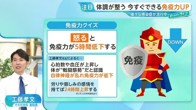 免疫力と生活習慣に関する書籍を出版している内科医の工藤孝文氏によると、怒ると心拍数や血圧が上昇し、体が“戦闘態勢”だと認識。これにより自律神経が乱れ免疫力が低下してしまうといいます。