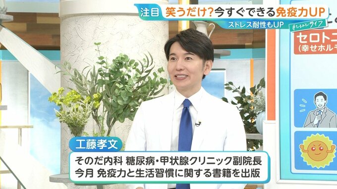 「笑う」ことで、脳内に“幸せホルモン”セロトニンが分泌されます。これによりストレス耐性が上がったり、免疫細胞(NK細胞)の働きが高まったりします。