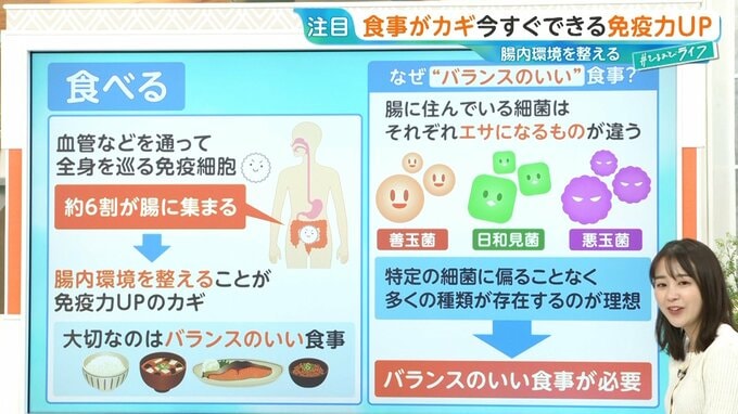 大切なのはバランスの良い食事。善玉菌・日和見菌・悪玉菌など、腸に住んでいる細菌はそれぞれエサになるものが違います。特定の細菌に偏ることなく多くの種類が存在するのが理想です。
