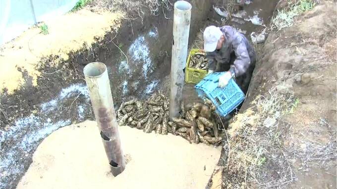 深さ2メートル、幅2メートル、長さ7メートルの穴を掘り、その中にイモを敷き詰めていきます。そして、丁寧にもみ殻をまいて保温します。