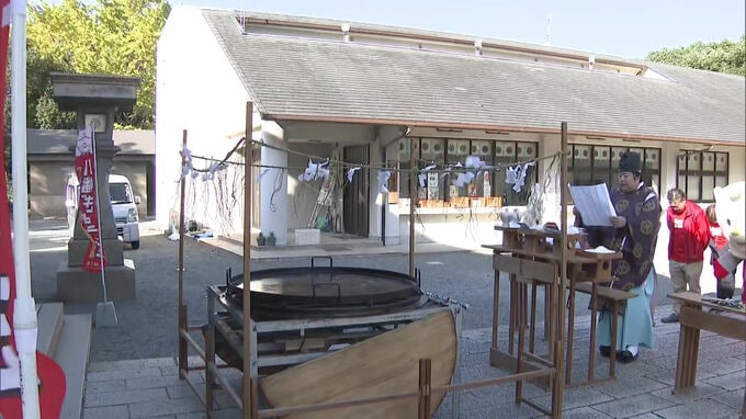 北九州市八幡東区の豊山八幡神社。7日午後、神社が保管してきた大鉄鍋を取り出し祭りの成功を祈願する神事が行われました。