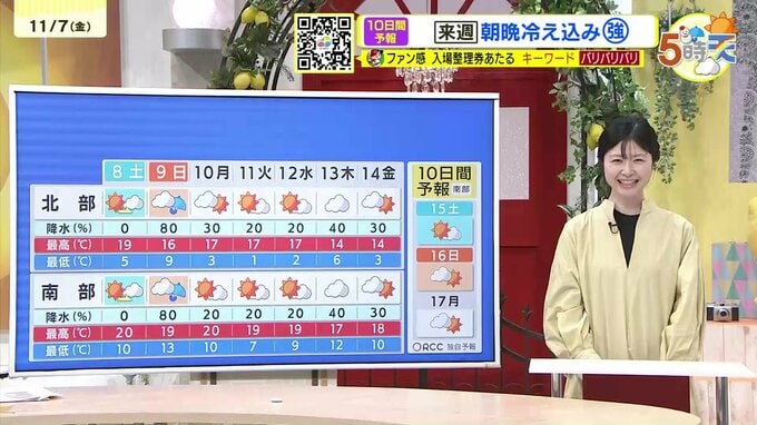 きょう7日(金)は「立冬」でしたが、広島県内はよく日差しが届き、小春日和となりました。最高気温は、大竹市で22.4℃、広島市中区で21.8℃、三次市で19.8℃でした。8日(土)高気圧に覆われて晴れる 日差しが暖…