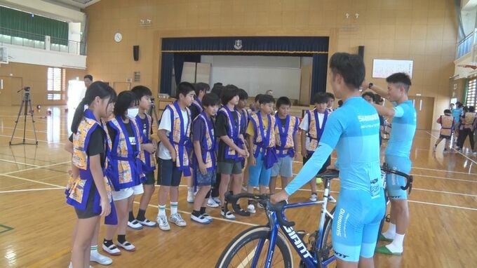 交流会では、児童たちがエイサーで選手を迎えたあと、「シマノレーシングチーム」の野寺秀徳監督が、ロードレースの魅力や、ツール・ド・おきなわの2023年大会で2位になった経験をもとにチームワークの大切さなどを語りました。