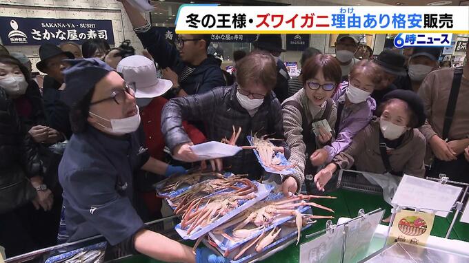 冬の味覚の王様・ズワイガニ。セリたて、でも格安販売です。 阪神梅田本店に集まった客の目当ては、冬の味覚・ズワイガニです。カニが出てくるや否や、陳列される間もなく大勢の人たちがわれ先にと手に取ります。…